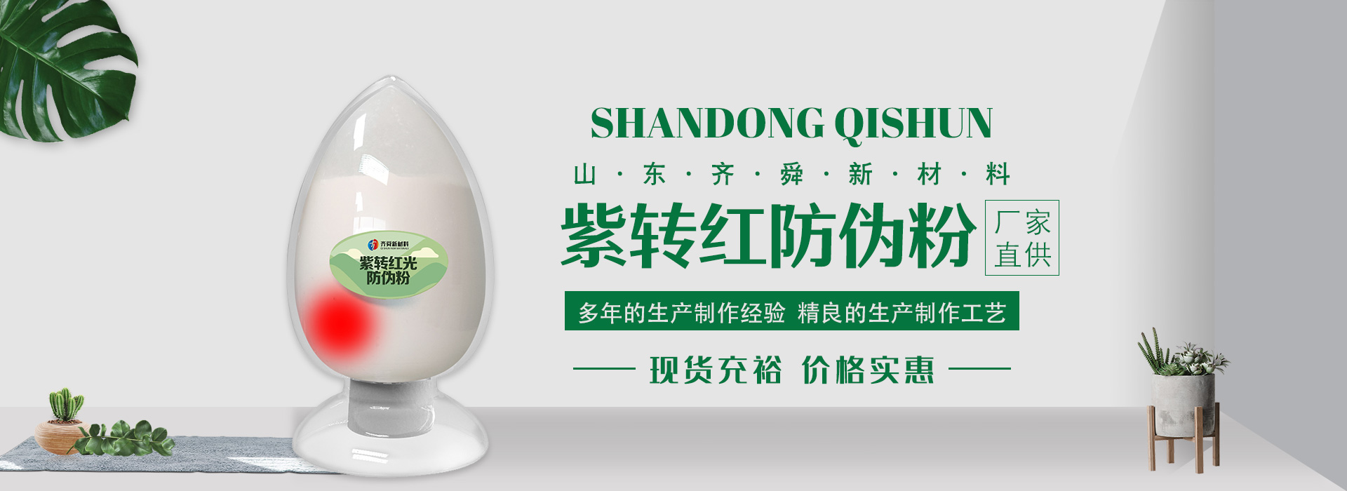 我公司前身為2011年成立的淄博舜明熒光科技有限公司。隨著公司的發(fā)展,廠址從淄博搬遷到青島,2020年5月公司重新注冊(cè)為山東齊舜新材料有限公司。公司注冊(cè)資本2000萬元,主要從事新材料研究和開發(fā)。目前主要產(chǎn)品包括:農(nóng)膜用轉(zhuǎn)光粉、轉(zhuǎn)光母粒以及轉(zhuǎn)光農(nóng)膜;農(nóng)膜用長(zhǎng)效防霧流滴涂覆液;復(fù)合肥添加劑及葉面肥(稀土微肥);防偽粉;LED封裝熒光粉;夜光粉;太陽能光伏電池增效熒光粉;鋰電池正極材料等。